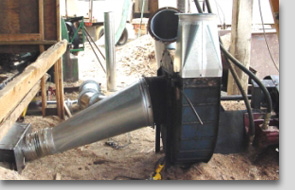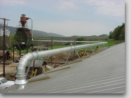 Manufactured was a cyclone collector that included an inlet transition, support stand, weather cap with all welded construction. A fan transition with galvanized pipe and ells was ran to the collector. Flex connection to the vibrating convey offset the transition with tap to fines chipper thru a fan inlet to discharge up thru the roof. The duct was then under the conveyor and pick up the fines chipper.