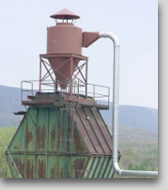 Manufactured was a cyclone collector that included an inlet transition, support stand, weather cap with all welded construction. A fan transition with galvanized pipe and ells was ran to the collector. Flex connection to the vibrating convey offset the transition with tap to fines chipper thru a fan inlet to discharge up thru the roof. The duct was then under the conveyor and pick up the fines chipper.